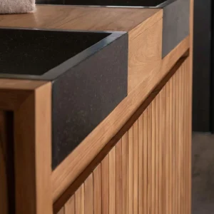 Le teck massif est le bois recommandé pour les meubles sous vasque bois grâce à sa résistance à l’humidité, sa stabilité et sa longévité. D’autres bois exotiques peuvent convenir s’ils sont correctement traités. Découvrez la qualité de ce bois avec ce meuble sous vasque, équipé de 2 vasques noires en terrazzo.