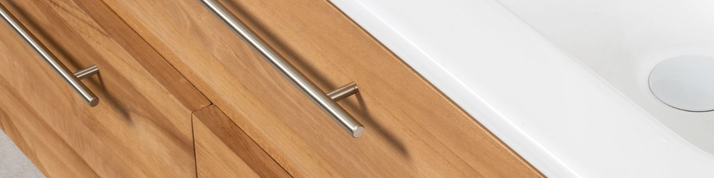 La collection Bagster apporte une touche chaleureuse et contemporaine à la salle de bain avec des meubles en teck associés à des finitions élégantes. Disponible en 80 cm et 120 cm, elle permet de composer un espace adapté aussi bien aux petites pièces qu’aux salles de bain plus généreuses.