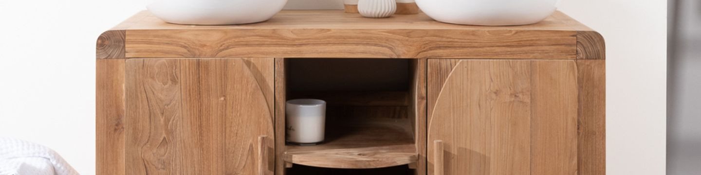 La collection Rétro apporte du caractère à la salle de bain avec du teck massif et un style intemporel, chaleureux et facile à assortir. Elle propose un meuble vasque 120 cm pour une composition élégante, ainsi que des solutions gain de place comme le petit meuble suspendu 50 cm et le meuble 44 cm idéal pour WC ou petite salle d’eau.