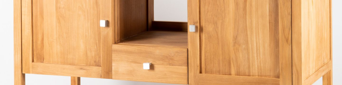 La collection Théa mise sur l’élégance naturelle du teck massif et une conception pensée pour la vraie vie. Chaque meuble combine de beaux volumes de rangement, placards, tiroirs et niche ouverte pour garder serviettes et essentiels toujours à portée de main.