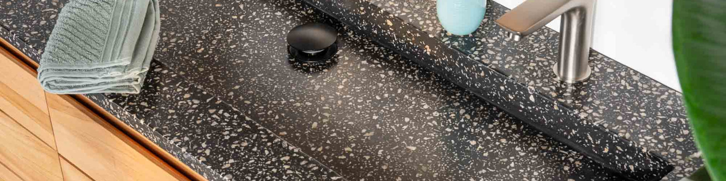 Découvrez notre sélection de meubles de salle de bain avec plan vasque en terrazzo, pour une salle d’eau raffinée, intemporelle, et faite pour durer. Pour mieux connaître la matière, découvrez notre guide : “Terrazzo et teck, élégance naturelle”.