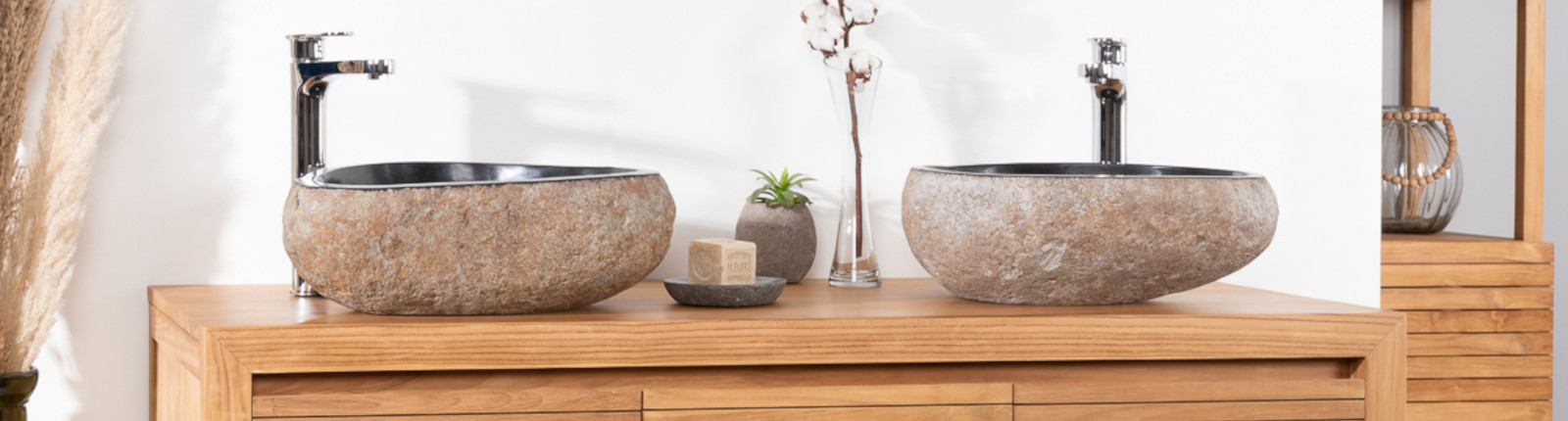 Découvrez notre univers salle de bain, pensé pour créer des espaces élégants, harmonieux et pleins de caractère. Meubles en teck, vasques en marbre, en pierre, en céramique ou en terrazzo, miroirs, robinetterie et accessoires s’associent ici pour composer une salle de bain cohérente et raffinée. Cet univers a été conçu pour vous aider à imaginer une pièce à votre image, entre matières naturelles, lignes soignées et inspirations durables.